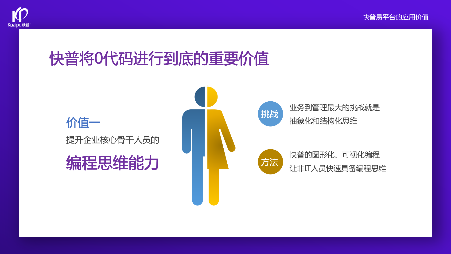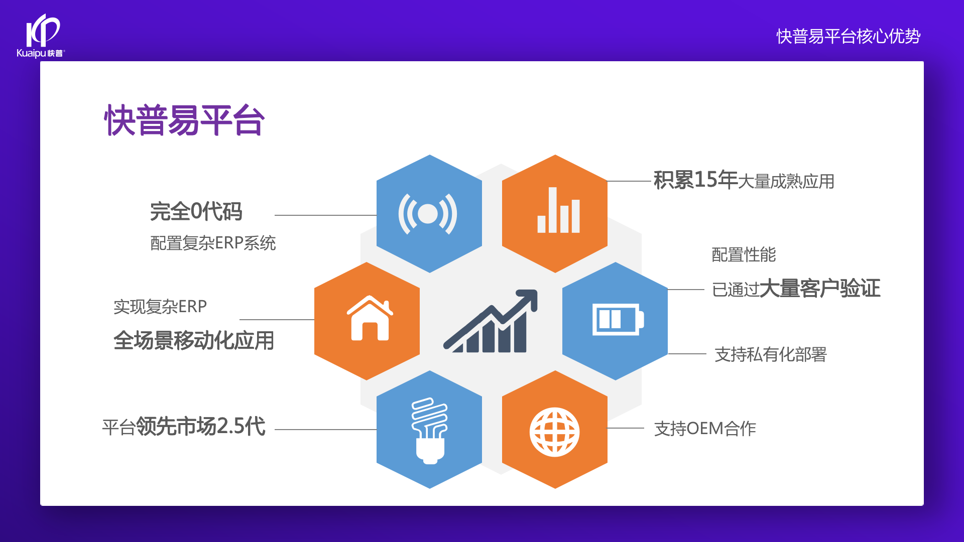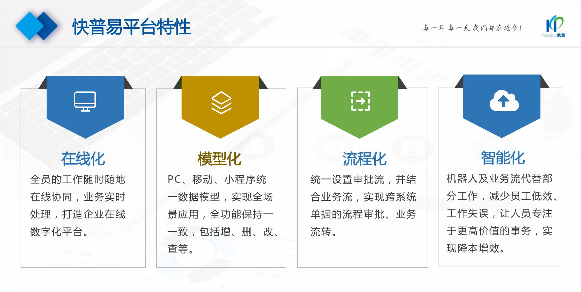 為了解決市場(chǎng)需求與平臺(tái)產(chǎn)品瓶頸等矛盾,實(shí)現(xiàn)徹底的零代碼平臺(tái),快普?qǐng)?jiān)持理念創(chuàng)新,以理念推動(dòng)平臺(tái)技術(shù)的創(chuàng)新。“以不變應(yīng)萬變”的理念:分析哪些東西未來肯定不變?哪些趨勢(shì)未來一定會(huì)變?從變化中找出不變的因素,從不變中找出變動(dòng)的因素;從量變到質(zhì)變,經(jīng)歷萬變總結(jié)抽象出不變的本質(zhì)?;诳炱臻L期的信息化服務(wù)經(jīng)驗(yàn),開發(fā)配置出企業(yè)數(shù)字化轉(zhuǎn)型工具:快普易平臺(tái)成功解決了企業(yè)數(shù)字化轉(zhuǎn)型升級(jí)面臨的客戶大量個(gè)性化需求,真正實(shí)現(xiàn)隨需而變的設(shè)計(jì)理念,大大降低了信息化投入成本,提高信息化效率,幫助企業(yè)實(shí)現(xiàn)自主可控的技術(shù)創(chuàng)新,從而進(jìn)一步推動(dòng)企業(yè)的業(yè)務(wù)創(chuàng)新和管理創(chuàng)新。