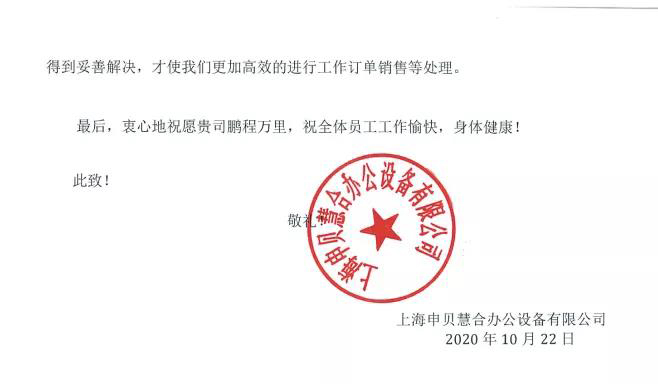 近日,上海申貝慧合辦公設備有限公司(以下簡稱“申貝慧合”)向我司發(fā)來感謝信。