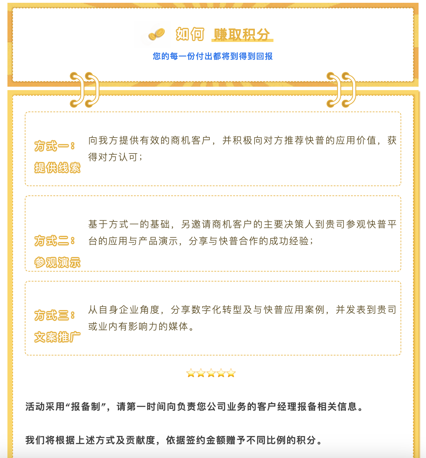 為進(jìn)一步回饋老用戶(hù)的貢獻(xiàn),現(xiàn)誠(chéng)邀您參與“快普感恩回饋大行動(dòng)!”,與我們共享數(shù)字經(jīng)濟(jì)發(fā)展的紅利!通過(guò)主動(dòng)推薦、轉(zhuǎn)介紹客戶(hù),您將獲取豐厚的積分返利,讓您的每一份付出都得到實(shí)質(zhì)性的回報(bào),人脈資源也可以獲得變現(xiàn)!