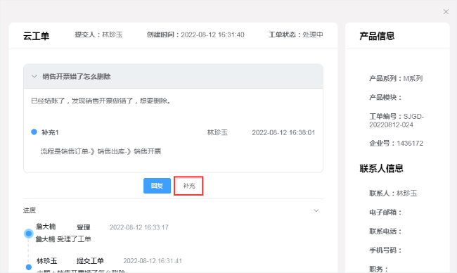 第二步:工單被客服認領(lǐng)后,您可看到左上角有具體的受理工程師,咨詢自動形成一個問題管理。