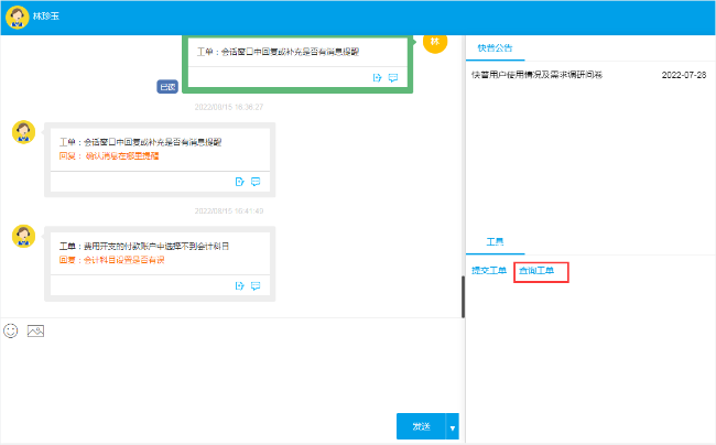 方法一、 通過會話窗口右邊“查詢工單”即可查看所有提交過的問題
