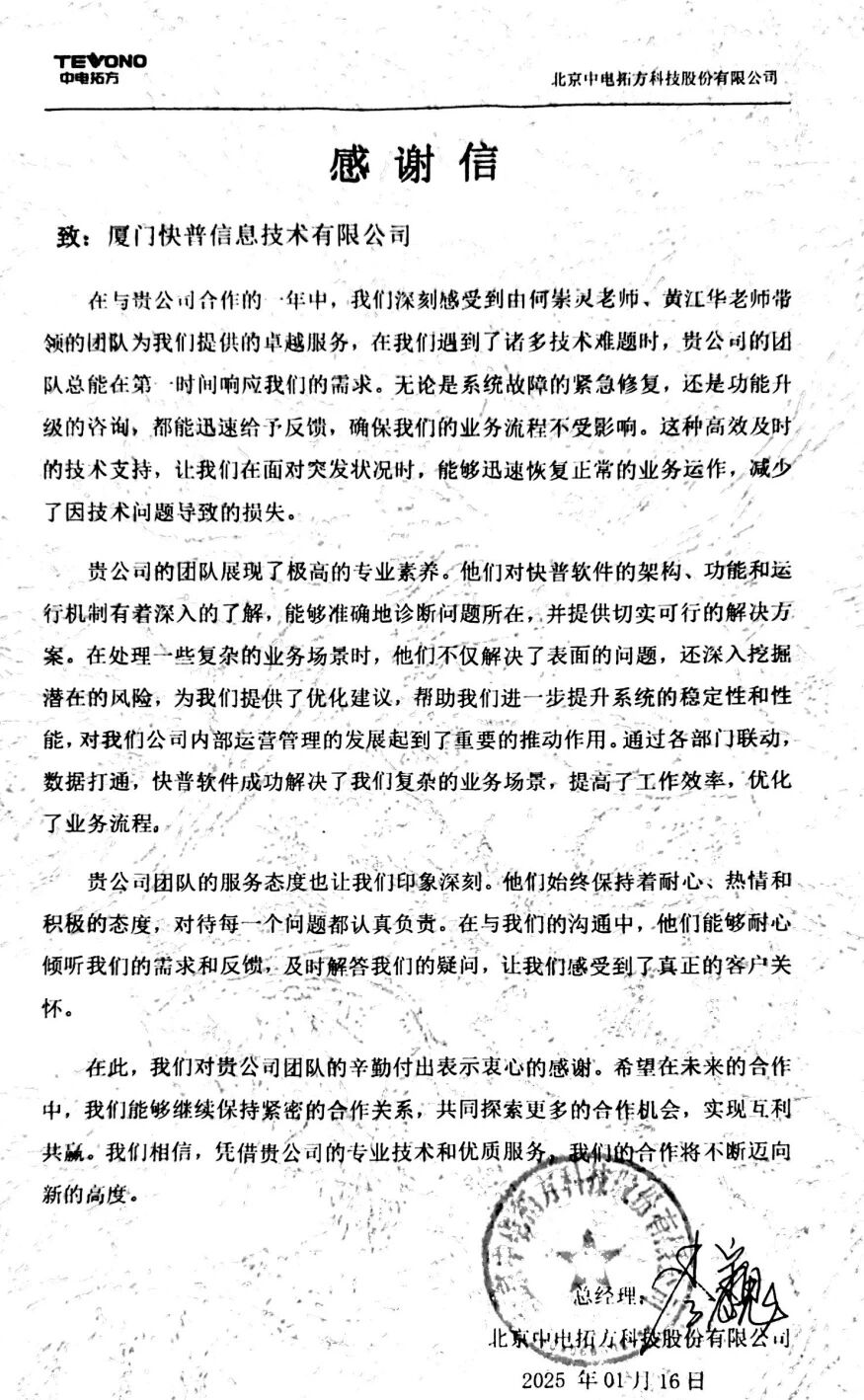 【快普簡訊】 北京中電拓方科技股份有限公司向我司發(fā)來感謝信,對何崇靈老師、黃江華老師帶領的實施小組在過去一年中提供的優(yōu)質服務表示高度認可和衷心感謝。來信不僅是對快普實施團隊專業(yè)能力的肯定,更是對快普“客戶至上”服務理念的詮釋。